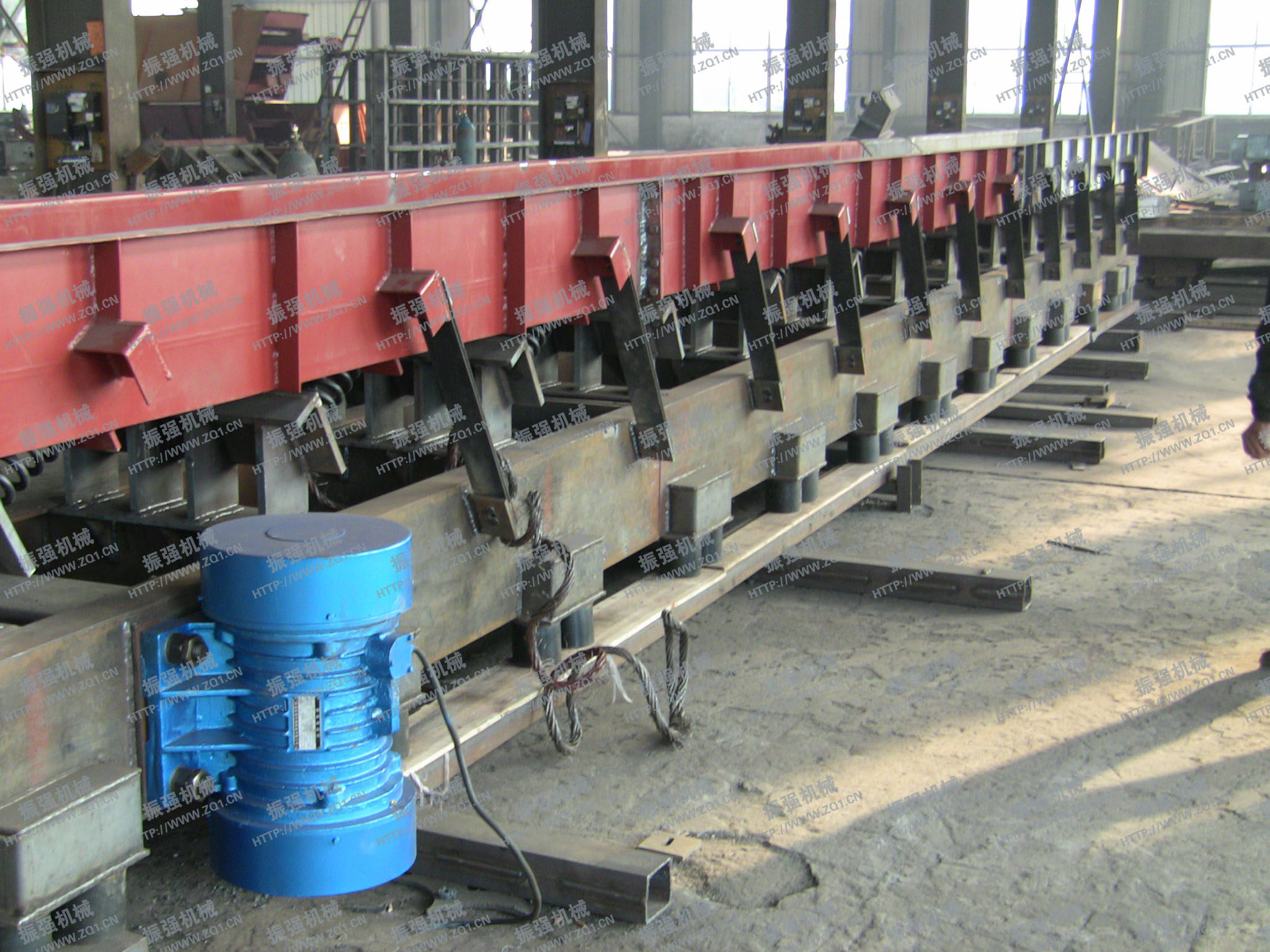 - SZF型慣性振動輸送機采用兩臺振動電機作為激振動源,運用自同步原理,兩臺振動電機反向轉(zhuǎn)動,使輸送機底部平衡架產(chǎn)生往復(fù)振動,經(jīng)過主振簧與導(dǎo)向板簧的作用,帶動上部輸送槽振動,從而達到輸送物料的目的。該機是一種通用輸送機械,除用于水泥行業(yè)外,還可用于冶金、礦山、化工、電力等行業(yè),是一種理想的新型輸送設(shè)備。