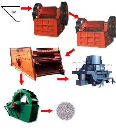 沙石生產線,砂石生產線,砂石生產線設備,砂石線,砂石生產設備基本流程:大塊石料經料倉由振動給料機均勻地送進鄂式破碎機進行粗碎,粗碎后的石料由皮帶輸送機送到反擊式破碎機進行進一步破碎;不滿足粒度要求的石子由皮帶輸送機返料送到反擊式破碎機進行再次破碎,形成閉路多次循環。
